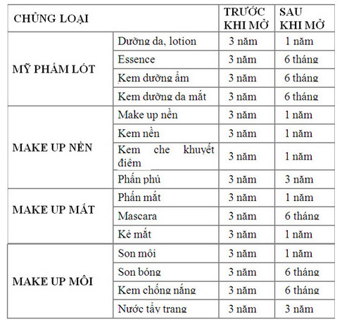 1. Hạn sử dụng các loại mỹ phẩm thông dụng
