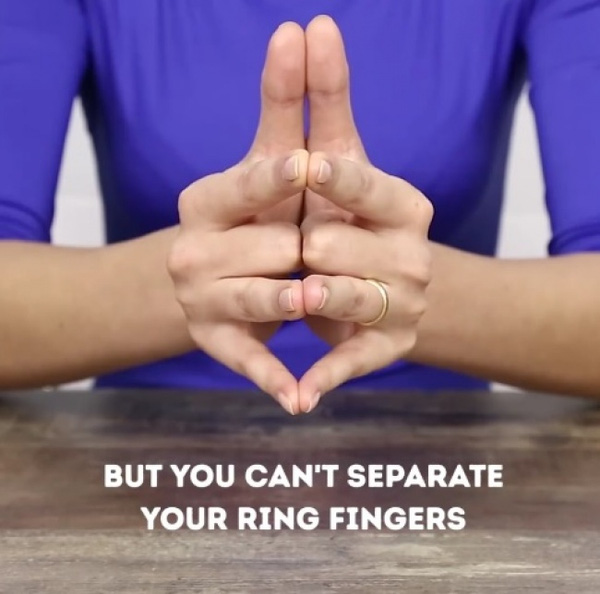 Hãy đặt hai bàn tay chạm vào nhau giống như hình dưới đây và cố gắng tách các ngón tương đồng ra khỏi nhau nhé. Sẽ có những ngón rời xa nhau rất dễ dàng đó.